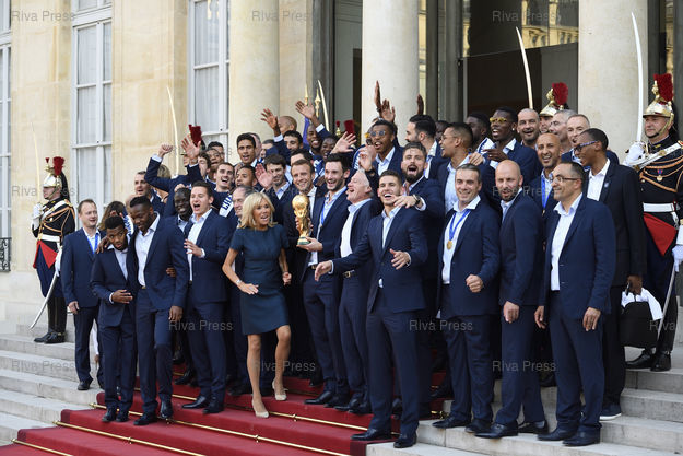 Légende : Réception au palais de l'Elysée à l'occasion de la victoire de l'équipe de France à la Coupe du monde de football 2018. Emmanuel et Brigitte Macron posent avec les joueurs /// Reception at the Elysee Palace on the occasion of the victory of the France team at the 2018 World Cup. Emmanuel and Brigitte Macron pose with the players - Paris - 16/07/2018 - Photo © Lionel Préau +33 (0)6 68 12 83 77