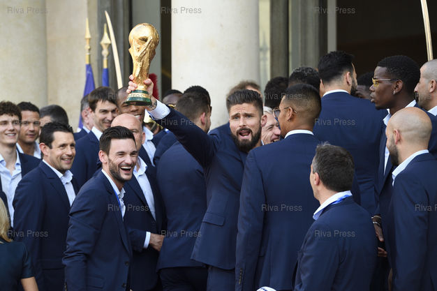 Légende : Réception au palais de l'Elysée à l'occasion de la victoire de l'équipe de France à la Coupe du monde de football 2018. Emmanuel et Brigitte Macron posent avec les joueurs. Olivier Giroud brandit la Coupe /// Reception at the Elysee Palace on the occasion of the victory of the France team at the 2018 World Cup. Emmanuel and Brigitte Macron pose with the players. Olivier Giroud holds the Cup - Paris - 16/07/2018 - Photo © Lionel Préau +33 (0)6 68 12 83 77
