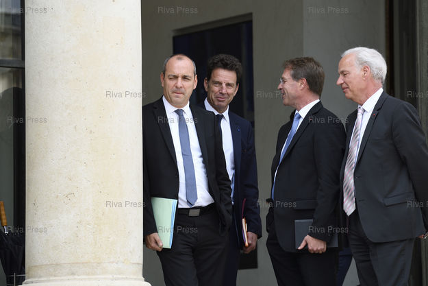 Caption : Emmanuel Macron reçoit les partenaires sociaux au Palais de l'Elysée pour évoquer avec eux l'agenda social des prochains mois. Laurent Berger, Secrétaire général de la CFDT - Geoffroy Roux de Bézieux, Président du MEDEF - François Asselin, Président de la CPME - Alain Griset, Président de l'U2P /// Emmanuel Macron receives the social partners at the Elysée Palace to discuss with them the social agenda of the coming months. Laurent Berger, General Secretary of the CFDT - Geoffroy Roux de Bézieux, President of the MEDEF - François Asselin, President of the CPME - Alain Griset, President of the U2P - Paris - 17/07/2018 - Photo © Lionel Préau +33 (0)6 68 12 83 77