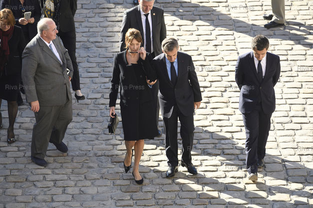Légende : Hommage national à Charles Aznavour à l'Hôtel des Invalides. Carla Bruni-Sarkozy - Nicolas Sarkozy - Gérald Darmanin /// National tribute to Charles Aznavour at the Hôtel des Invalides. Carla Bruni-Sarkozy - Nicolas Sarkozy - Gérald Darmanin - Paris - 05/10/2018 - Photo © Lionel Préau +33 (0)6 68 12 83 77