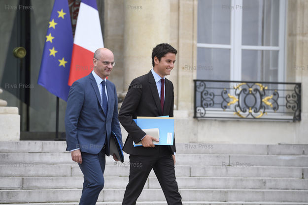 Légende : Conseil des ministres au palais de l'Elysée. Jean-Michel Blanquer, ministre de l'Education nationale et de la Jeunesse - Gabriel Attal, secrétaire d'Etat auprès du ministre de l'Education Nationale et de la Jeunesse /// Cabinet meeting at the Elysee Palace. Jean-Michel Blanquer, Minister of National Education and Youth - Gabriel Attal, Junior Minister to the Minister of National Education and Youth - Paris - 17/10/2018 - Photo © Lionel Préau +33 (0)6 68 12 83 77
