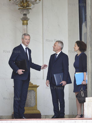 Légende : Conseil des ministres au palais de l'Elysée. Bruno Le Maire, ministre de l'Economie et des Finances - François de Rugy, ministre d'Etat, ministre de la Transition écologique et solidaire - Emmanuelle Wargon, secrétaire d'Etat auprès du ministre d'Etat, ministre de la transition écologique et solidaire /// Cabinet meeting at the Elysee Palace. Bruno Le Maire, Minister of Economy and Finance - François de Rugy, Minister of State, Minister of Ecological and Concerted Transition - Emmanuelle Wargon, Junior Minister to the Minister of State, Minister of Ecological and Solidarity Transition - Paris - 17/10/2018 - Photo © Lionel Préau +33 (0)6 68 12 83 77