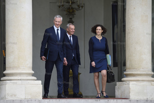 Légende : Conseil des ministres au palais de l'Elysée. Bruno Le Maire, ministre de l'Economie et des Finances - François de Rugy, ministre d'Etat, ministre de la Transition écologique et solidaire - Emmanuelle Wargon, secrétaire d'Etat auprès du ministre d'Etat, ministre de la transition écologique et solidaire /// Cabinet meeting at the Elysee Palace. Bruno Le Maire, Minister of Economy and Finance - François de Rugy, Minister of State, Minister of Ecological and Concerted Transition - Emmanuelle Wargon, Junior Minister to the Minister of State, Minister of Ecological and Solidarity Transition - Paris - 17/10/2018 - Photo © Lionel Préau +33 (0)6 68 12 83 77