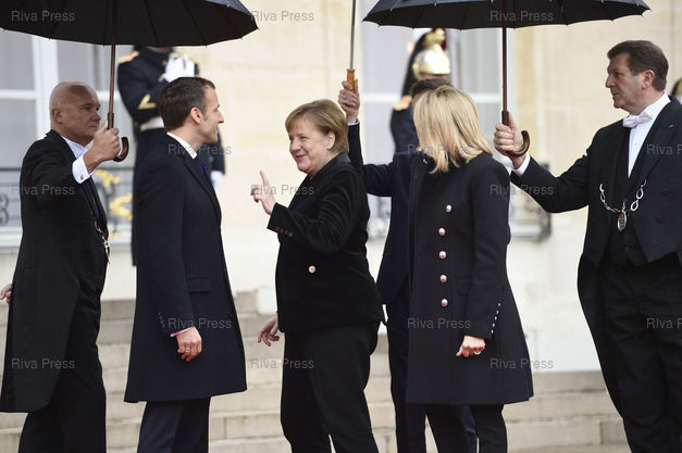 Légende : Accueil des chefs d'Etats et déjeuner au Palais de l'Elysée à l'occasion des commémorations du 11 novembre. Emmanuel et Brigitte Macron accueillent Angela Merkel /// Heads of State welcome and lunch at the Elysee Palace on the occasion of the commemoration of November 11. Emmanuel and Brigitte Macron welcome Angela Merkel - Paris - 11/11/2018 - Photo © Lionel Préau +33 (0)6 68 12 83 77
