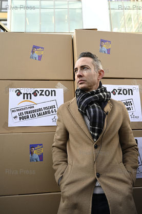 Légende : Ian Brossat, tête de liste du Parti communiste français (PCF) aux élections européennes, devant le siège social d'Amazon France pour réclamer une taxation plus juste du géant américain, et dénoncer le licenciement de salariés Gilets jaunes /// Ian Brossat, head of list of the French Communist Party (PCF) for the European elections, in front of the head office of Amazon France to claim a fairer taxation of the American giant, and denounce the dismissal of Yellow Vest employees - Clichy - 18/02/2019 - Photo © Lionel Préau +33 (0)6 68 12 83 77