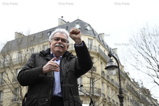 Légende : André Chassaigne, député du Puy-de-Dôme, salue le passage des Gilets Jaunes lors du rassemblement où le parti présente ses 10 propositions pour la France, remises au président de la république et au gouvernement /// André Chassaigne, MP of the Puy-de-Dôme, greets the Yellow Vests at the rally where the party presents its 10 proposals for France, given to the president of the republic and the government - Paris - 16/03/2019 - Photo © Lionel Préau +33 (0)6 68 12 83 77