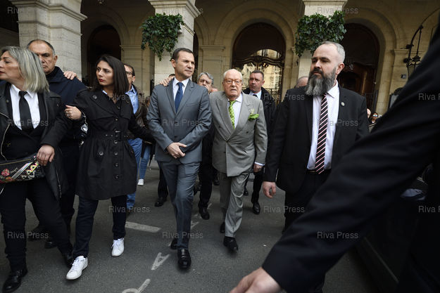 Caption : Jean-Marie Le Pen, député européen, ancien président du Front National, se rend au pied de la statue de Jeanne d'Arc pour y déposer une gerbe de fleurs et prononcer un discours . Avec Gérald Gérin /// Jean-Marie Le Pen, MEP, former president of the Front National far-right Party, goes to the foot of the statue of Joan of Arc to lay a wreath and give a speech. With Gérald Gérin - Paris - 01/05/2019 - Photo © Lionel Préau +33 (0)6 68 12 83 77