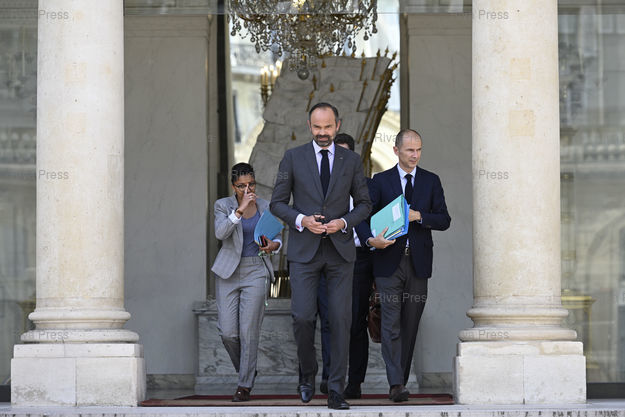 Légende : Premier Conseil de défense écologique au palais de l'Elysée. Edouard Philippe, premier ministre, avec Zelia Cesarion, conseillère presse, et Charles Hufnagel, conseiller communication /// First Ecological Defense Council at the Elysée Palace. Edouard Philippe, Prime Minister, with Zelia Cesarion, Press Counselor, and Charles Hufnagel, Communication Advisor - Paris - 23/05/2019 - Photo © Lionel Préau +33 (0)6 68 12 83 77