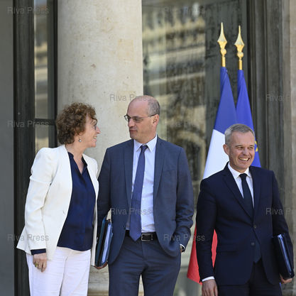 Légende : Conseil des ministres au palais de l'Elysée. Muriel Pénicaud, ministre du Travail - Jean-Michel Blanquer, ministre de l'Education nationale et de la Jeunesse - François de Rugy, ministre d'Etat, ministre de la Transition écologique et solidaire /// Cabinet meeting at the Elysee Palace. Muriel Pénicaud, Minister of Labour - Jean-Michel Blanquer, Minister of National Education and Youth - François de Rugy, Minister of State, Minister of Ecological and Concerted Transition - Paris - 03/07/2019 - Photo © Lionel Préau +33 (0)6 68 12 83 77