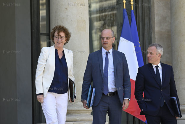 Légende : Conseil des ministres au palais de l'Elysée. Muriel Pénicaud, ministre du Travail - Jean-Michel Blanquer, ministre de l'Education nationale et de la Jeunesse - François de Rugy, ministre d'Etat, ministre de la Transition écologique et solidaire /// Cabinet meeting at the Elysee Palace. Muriel Pénicaud, Minister of Labour - Jean-Michel Blanquer, Minister of National Education and Youth - François de Rugy, Minister of State, Minister of Ecological and Concerted Transition - Paris - 03/07/2019 - Photo © Lionel Préau +33 (0)6 68 12 83 77