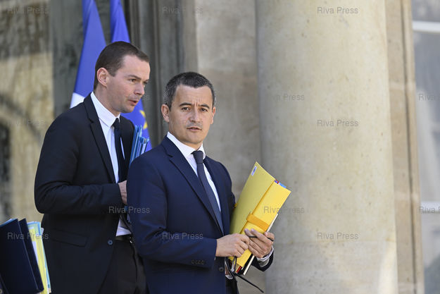 Légende : Conseil des ministres au palais de l'Elysée. Olivier Dussopt, secrétaire d'Etat auprès du ministre de l'Action et des Comptes Publics - Gérald Darmanin, ministre de l'Action et des Comptes publics /// Cabinet meeting at the Elysee Palace. Olivier Dussopt, Junior Minister to the Minister of Action and Public Accounts - Gérald Darmanin, Minister of the Action and Public Accounts - Paris - 03/07/2019 - Photo © Lionel Préau +33 (0)6 68 12 83 77