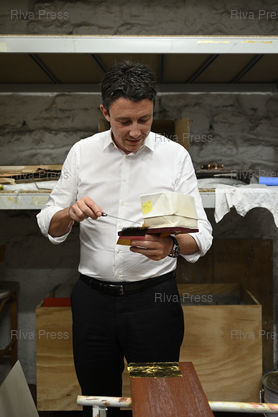 Légende : Benjamin Griveaux, candidat LREM à la mairie de Paris, rencontre des artisans d'art de l'atelier Mériguet-Carrère. Dorure à la feuille d'or /// Benjamin Griveaux, LREM candidate for mayor of Paris, meets artisans of the workshop Mériguet-Carrère. Gildind with gold leaf - Paris - 17/09/2019 - Photo © Lionel Préau +33 (0)6 68 12 83 77