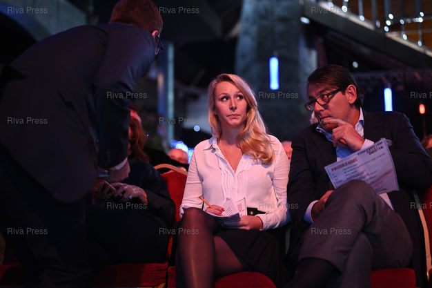 Légende : Première "Convention de la droite", réunion de la droite nationaliste et identitaire, pour une "alternative au progressisme" (La Palmeraie). Marion Maréchal - Samuel Maréchal /// First "Convention of the Right", meeting of the nationalist and far-right, for an "alternative to progressism" (La Palmeraie). Marion Maréchal, granddaughter of Jean-Marie Le Pen - Samuel Maréchal, adoptive father of Marion Maréchal - Paris - 28/09/2019 - Photo © Lionel Préau +33 (0)6 68 12 83 77
