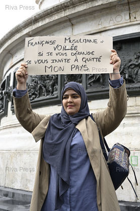 Légende : Rassemblement contre "l'islamophobie" Place de la République après qu'un élu du Rassemblement National demande au Conseil régional de Bourgogne-Franche-Comté, le 11 octobre, à une mère de famille portant le hijab de retirer son voile islamique, et que le ministre de l'éducation nationale affirme que "le voile n'est pas souhaitable dans notre société" /// Rally against "Islamophobia" Place de la République after a member of the far-right Rassemblement National Party asks at the Regional Council of Bourgogne-Franche-Comté, October 11, a mother wearing the hijab to remove her Islamic veil, and the minister of national education says that "the veil is not desirable in our society" - Paris - 19/10/2019 - Photo © Lionel Préau +33 (0)6 68 12 83 77