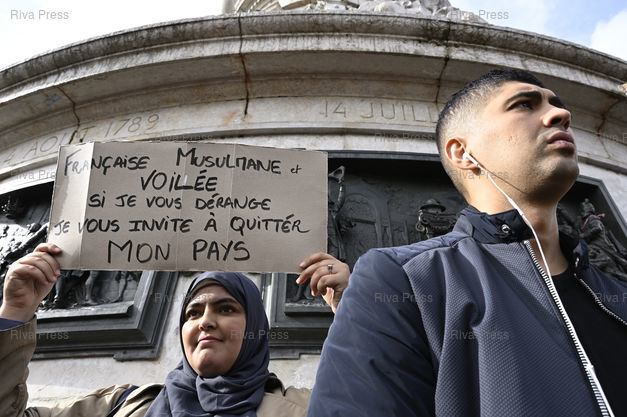 Légende : Rassemblement contre "l'islamophobie" Place de la République après qu'un élu du Rassemblement National demande au Conseil régional de Bourgogne-Franche-Comté, le 11 octobre, à une mère de famille portant le hijab de retirer son voile islamique, et que le ministre de l'éducation nationale affirme que "le voile n'est pas souhaitable dans notre société" /// Rally against "Islamophobia" Place de la République after a member of the far-right Rassemblement National Party asks at the Regional Council of Bourgogne-Franche-Comté, October 11, a mother wearing the hijab to remove her Islamic veil, and the minister of national education says that "the veil is not desirable in our society" - Paris - 19/10/2019 - Photo © Lionel Préau +33 (0)6 68 12 83 77