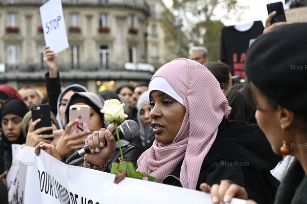 Légende : Rassemblement contre "l'islamophobie" Place de la République après qu'un élu du Rassemblement National demande au Conseil régional de Bourgogne-Franche-Comté, le 11 octobre, à une mère de famille portant le hijab de retirer son voile islamique, et que le ministre de l'éducation nationale affirme que "le voile n'est pas souhaitable dans notre société" /// Rally against "Islamophobia" Place de la République after a member of the far-right Rassemblement National Party asks at the Regional Council of Bourgogne-Franche-Comté, October 11, a mother wearing the hijab to remove her Islamic veil, and the minister of national education says that "the veil is not desirable in our society" - Paris - 19/10/2019 - Photo © Lionel Préau +33 (0)6 68 12 83 77