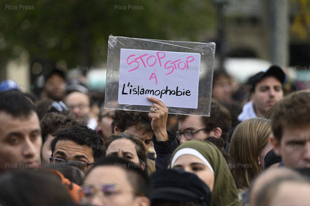 Légende : Rassemblement contre "l'islamophobie" Place de la République après qu'un élu du Rassemblement National demande au Conseil régional de Bourgogne-Franche-Comté, le 11 octobre, à une mère de famille portant le hijab de retirer son voile islamique, et que le ministre de l'éducation nationale affirme que "le voile n'est pas souhaitable dans notre société" /// Rally against "Islamophobia" Place de la République after a member of the far-right Rassemblement National Party asks at the Regional Council of Bourgogne-Franche-Comté, October 11, a mother wearing the hijab to remove her Islamic veil, and the minister of national education says that "the veil is not desirable in our society" - Paris - 19/10/2019 - Photo © Lionel Préau +33 (0)6 68 12 83 77