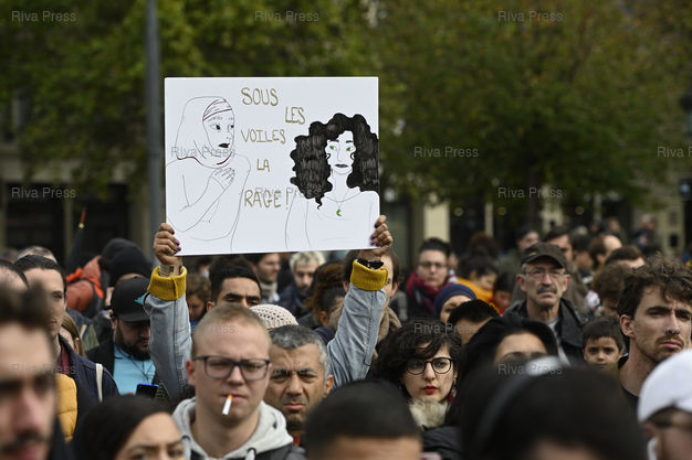 Légende : Rassemblement contre "l'islamophobie" Place de la République après qu'un élu du Rassemblement National demande au Conseil régional de Bourgogne-Franche-Comté, le 11 octobre, à une mère de famille portant le hijab de retirer son voile islamique, et que le ministre de l'éducation nationale affirme que "le voile n'est pas souhaitable dans notre société" /// Rally against "Islamophobia" Place de la République after a member of the far-right Rassemblement National Party asks at the Regional Council of Bourgogne-Franche-Comté, October 11, a mother wearing the hijab to remove her Islamic veil, and the minister of national education says that "the veil is not desirable in our society" - Paris - 19/10/2019 - Photo © Lionel Préau +33 (0)6 68 12 83 77