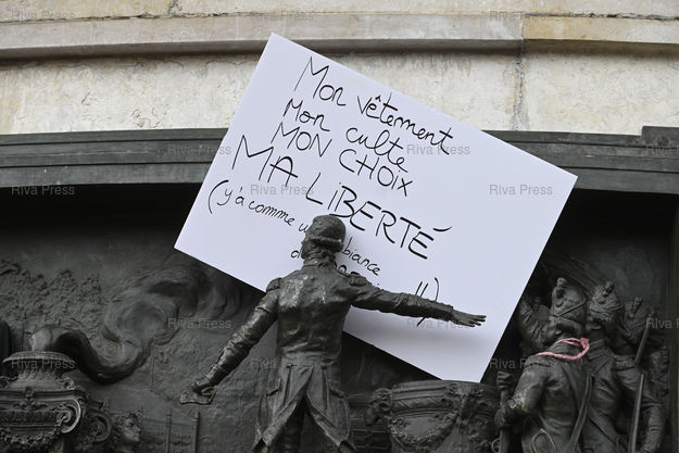 Légende : Rassemblement contre "l'islamophobie" Place de la République après qu'un élu du Rassemblement National demande au Conseil régional de Bourgogne-Franche-Comté, le 11 octobre, à une mère de famille portant le hijab de retirer son voile islamique, et que le ministre de l'éducation nationale affirme que "le voile n'est pas souhaitable dans notre société" /// Rally against "Islamophobia" Place de la République after a member of the far-right Rassemblement National Party asks at the Regional Council of Bourgogne-Franche-Comté, October 11, a mother wearing the hijab to remove her Islamic veil, and the minister of national education says that "the veil is not desirable in our society" - Paris - 19/10/2019 - Photo © Lionel Préau +33 (0)6 68 12 83 77