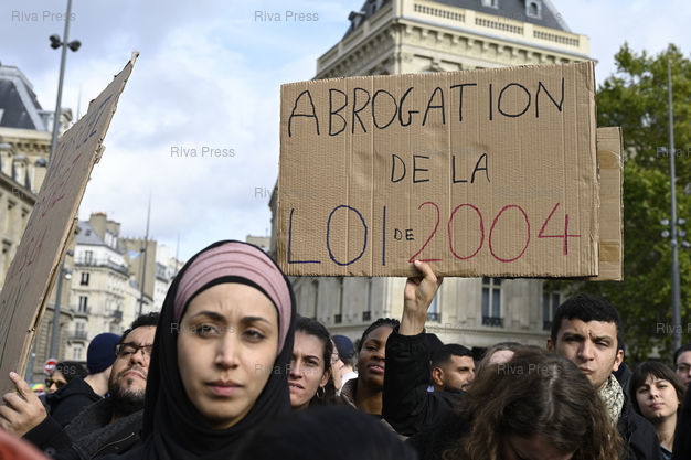 Légende : Rassemblement contre "l'islamophobie" Place de la République après qu'un élu du Rassemblement National demande au Conseil régional de Bourgogne-Franche-Comté, le 11 octobre, à une mère de famille portant le hijab de retirer son voile islamique, et que le ministre de l'éducation nationale affirme que "le voile n'est pas souhaitable dans notre société" /// Rally against "Islamophobia" Place de la République after a member of the far-right Rassemblement National Party asks at the Regional Council of Bourgogne-Franche-Comté, October 11, a mother wearing the hijab to remove her Islamic veil, and the minister of national education says that "the veil is not desirable in our society" - Paris - 19/10/2019 - Photo © Lionel Préau +33 (0)6 68 12 83 77