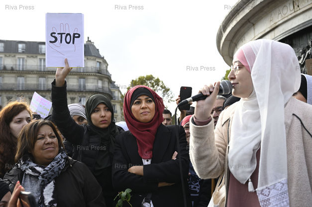 Légende : Rassemblement contre "l'islamophobie" Place de la République après qu'un élu du Rassemblement National demande au Conseil régional de Bourgogne-Franche-Comté, le 11 octobre, à une mère de famille portant le hijab de retirer son voile islamique, et que le ministre de l'éducation nationale affirme que "le voile n'est pas souhaitable dans notre société". A droite Maryam Pougetoux, une responsable de l'Unef à Paris dont le port du voile avait été jugé "choquant" par le ministre de l'Intérieur /// Rally against "Islamophobia" Place de la République after a member of the far-right Rassemblement National Party asks at the Regional Council of Bourgogne-Franche-Comté, October 11, a mother wearing the hijab to remove her Islamic veil, and the minister of national education says that "the veil is not desirable in our society". On the right, Maryam Pougetoux, a manager of the Unef student union in Paris whose wearing of the veil was considered "shocking" by the Minister of the Interior - Paris - 19/10/2019 - Photo © Lionel Préau +33 (0)6 68 12 83 77