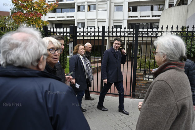 Caption : Benjamin Griveaux, candidat LREM aux élections municipales à Paris, se rend dans le 20eme arrondissement sur le thème de la sécurité et de la police municipale. En présence de Frédérique Calendra, maire du 20eme /// Benjamin Griveaux, LREM candidate for the municipal elections in Paris, in the 20th arrondissement on the theme of security and the municipal police. With Frédérique Calendra, mayor of the 20th - Paris - 06/11/2019 - Photo © Lionel Préau +33 (0)6 68 12 83 77