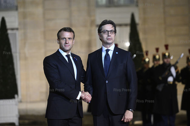 Légende : Emmanuel Macron reçoit les chefs d'Etat et de gouvernement et dirigeants d'organisations internationales participant au 2ème Forum de Paris sur la Paix pour un dîner au palais de l'Elysée. Emmanuel Macron accueille Stevo Pendarovski, président de la république de Macédoine du Nord /// Emmanuel Macron receives heads of state and government and leaders of international organizations participating in the 2nd Paris Peace Forum for a dinner at the Elysée Palace. Emmanuel Macron welcomes Stevo Pendarovski, President of North Macedonia - Paris - 11/11/2019 - Photo © Lionel Préau +33 (0)6 68 12 83 77