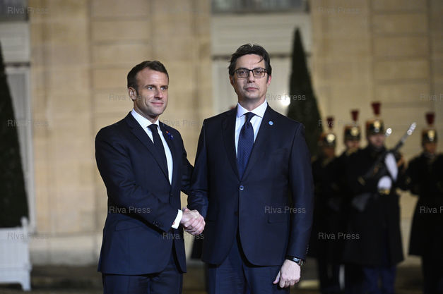 Caption : Emmanuel Macron reçoit les chefs d'Etat et de gouvernement et dirigeants d'organisations internationales participant au 2ème Forum de Paris sur la Paix pour un dîner au palais de l'Elysée. Emmanuel Macron accueille Stevo Pendarovski, président de la république de Macédoine du Nord /// Emmanuel Macron receives heads of state and government and leaders of international organizations participating in the 2nd Paris Peace Forum for a dinner at the Elysée Palace. Emmanuel Macron welcomes Stevo Pendarovski, President of North Macedonia - Paris - 11/11/2019 - Photo © Lionel Préau +33 (0)6 68 12 83 77