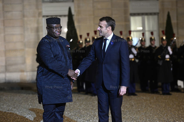 Légende : Emmanuel Macron reçoit les chefs d'Etat et de gouvernement et dirigeants d'organisations internationales participant au 2ème Forum de Paris sur la Paix pour un dîner au palais de l'Elysée. Emmanuel Macron accueille Julius Maada Bio, président de Sierra Leone /// Emmanuel Macron receives heads of state and government and leaders of international organizations participating in the 2nd Paris Peace Forum for a dinner at the Elysée Palace. Emmanuel Macron welcomes Julius Maada Bio, President of Sierra Leon - Paris - 11/11/2019 - Photo © Lionel Préau +33 (0)6 68 12 83 77