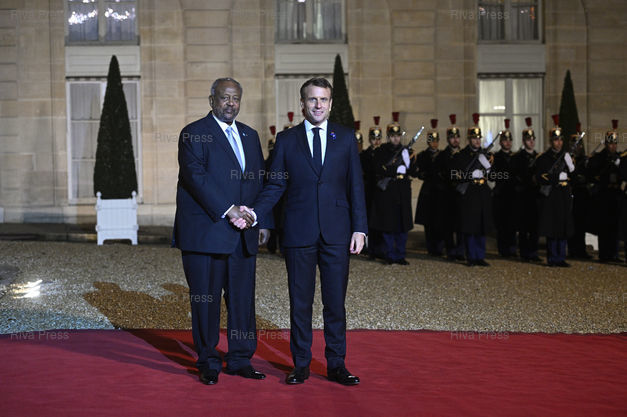 Légende : Emmanuel Macron reçoit les chefs d'Etat et de gouvernement et dirigeants d'organisations internationales participant au 2ème Forum de Paris sur la Paix pour un dîner au palais de l'Elysée. Emmanuel Macron accueille Ismail Omar Guelleh, président de la république de Djibouti /// Emmanuel Macron receives heads of state and government and leaders of international organizations participating in the 2nd Paris Peace Forum for a dinner at the Elysée Palace. Emmanuel Macron welcomes Ismail Omar Guelleh, President of the Republic of Djibouti - Paris - 11/11/2019 - Photo © Lionel Préau +33 (0)6 68 12 83 77