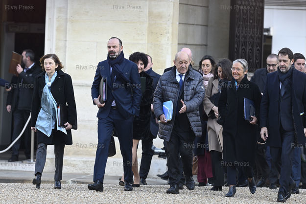 Légende : Conseil des ministres au palais de l'Elysée. Edouard Philippe, premier ministre, entouré par Florence Parly, ministre des Armées, et Jean-Yves Le Drian, ministre de l'Europe et des Affaires étrangères, Elisabeth Borne, ministre de la Transition écologique et solidaire, Christophe Castaner, ministre de l'Intérieur /// Cabinet meeting at the Elysee Palace. Edouard Philippe, Prime Minister, between Florence Parly, Minister of the Armed Forces, and Jean-Yves Le Drian, Minister of Europe and Foreign Affairs, Elisabeth Borne, Minister of Ecological and Concerted Transitionn Christophe Castaner, Minister of the Interior - Paris - 06/01/2020 - Photo © Lionel Préau +33 (0)6 68 12 83 77