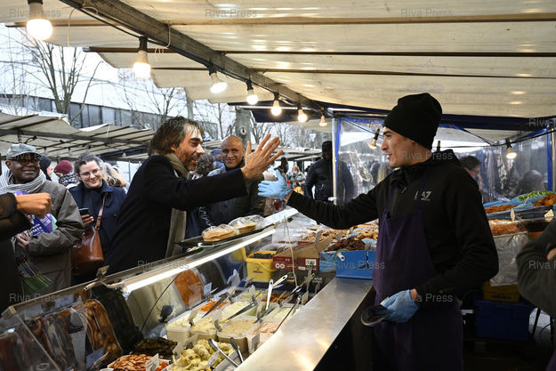 Légende : Cédric Villani, candidat à la mairie de Paris, en campagne sur le marché de la Place des Fêtes du 19ème arrondissement, avec Paula Forteza, députée des français établis hors de France, et tête de liste dans le 19e /// Cédric Villani, candidate for mayor of Paris, campaigning on the Place des Fêtes market in the 19th arrondissement, with Paula Forteza, MP for French citizen established outside of France, and head of list in the 19th - Paris - 16/02/2020 - Photo © Lionel Préau +33 (0)6 68 12 83 77