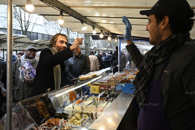 Légende : Cédric Villani, candidat à la mairie de Paris, en campagne sur le marché de la Place des Fêtes du 19ème arrondissement, avec Paula Forteza, députée des français établis hors de France, et tête de liste dans le 19e /// Cédric Villani, candidate for mayor of Paris, campaigning on the Place des Fêtes market in the 19th arrondissement, with Paula Forteza, MP for French citizen established outside of France, and head of list in the 19th - Paris - 16/02/2020 - Photo © Lionel Préau +33 (0)6 68 12 83 77