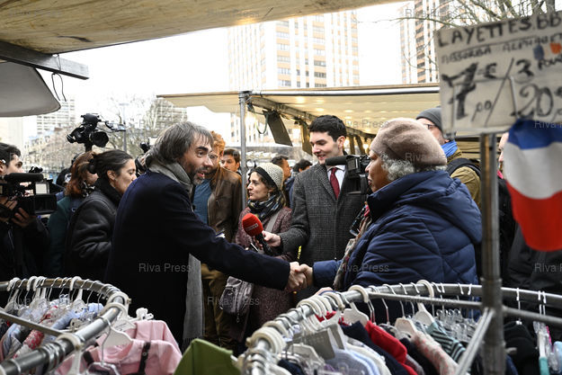 Légende : Cédric Villani, candidat à la mairie de Paris, en campagne sur le marché de la Place des Fêtes du 19ème arrondissement, avec Paula Forteza, députée des français établis hors de France, et tête de liste dans le 19e /// Cédric Villani, candidate for mayor of Paris, campaigning on the Place des Fêtes market in the 19th arrondissement, with Paula Forteza, MP for French citizen established outside of France, and head of list in the 19th - Paris - 16/02/2020 - Photo © Lionel Préau +33 (0)6 68 12 83 77