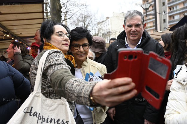 Légende : Rachida Dati, candidat Les Républicains à la mairie de Paris, en campagne sur le marché de la Place des Fêtes du 19ème arrondissement /// Rachida Datii, candidate of Les Republicains Party for mayor of Paris, campaigning on the Place des Fêtes market in the 19th arrondissement - Paris - 16/02/2020 - Photo © Lionel Préau +33 (0)6 68 12 83 77