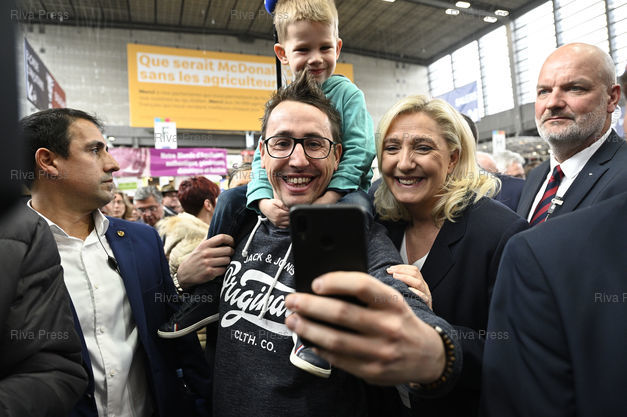 Légende : Marine Le Pen, présidente du Rassemblement National, visite le Salon de l'agriculture. En présence de Thierry Légier, garde du corps /// Marine Le Pen, President of the Rassemblement National far-right Party, visits the Agricultural Show. With Thierry Légier, bodyguard - Paris - 25/02/2020 - Photo © Lionel Préau +33 (0)6 68 12 83 77