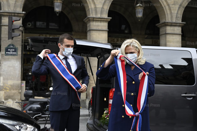 Légende : Marine Le Pen, présidente du Rassemblement National, et Jordan Bardella, vice-président du RN, député européen, portent un masque de protection contre le Covid-19 en période de confinement en se rendant au pied de la statue de Jeanne d'Arc pour y déposer une gerbe de fleurs /// Marine Le Pen, President of the far-right Rassemblement National Party, and Jordan Bardella, VP of the RN, MEP, wear a protective mask against the Covid-19 during lockdown while going to the foot of the statue of Joan of Arc to lay a wreath flowers - Paris - 01/05/2020 - Photo © Lionel Préau +33 (0)6 68 12 83 77
