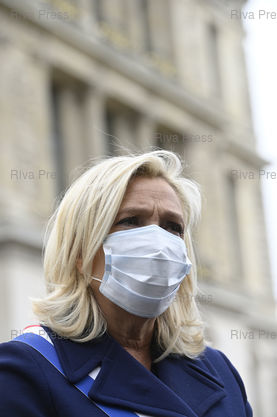 Légende : Marine Le Pen, présidente du Rassemblement National, et Jordan Bardella, vice-président du RN, député européen, portent un masque de protection contre le Covid-19 en période de confinement en se rendant au pied de la statue de Jeanne d'Arc pour y déposer une gerbe de fleurs /// Marine Le Pen, President of the far-right Rassemblement National Party, and Jordan Bardella, VP of the RN, MEP, wear a protective mask against the Covid-19 during lockdown while going to the foot of the statue of Joan of Arc to lay a wreath flowers - Paris - 01/05/2020 - Photo © Lionel Préau +33 (0)6 68 12 83 77