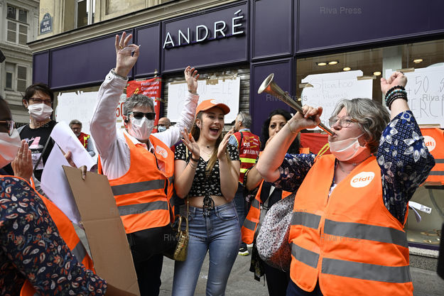 Légende : Les salariés de l'enseigne de chaussures André, rachetée en 2018 par le site de vente en ligne Spartoo, sont en grève et manifestent devant le magasin André Haussmann, inquiétés par le placement en redressement judiciaire de la société, mise en difficulté en raison de l'épidémie de Covid-19 et du confinement qui avait obligé la marque à fermer tous ses magasins /// The employees of the shoe brand André, bought in 2018 by the online sales site Spartoo, are on strike and demonstrate in front of the André Haussmann store, worried by the placement in bankruptcy of the company, put in difficulty due to the Covid-19 epidemic and the lockdown that had forced the brand to close all its stores - Paris - 30/06/2020 - Photo © Lionel Préau +33 (0)6 68 12 83 77