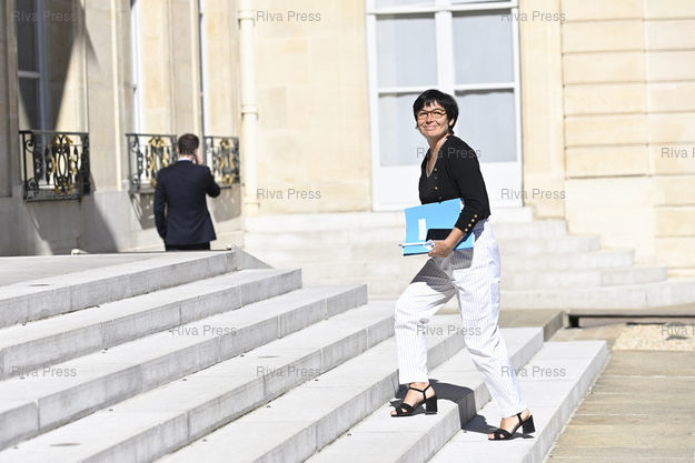 Légende : Conseil de défense écologique au palais de l'Elysée, à l'issue duquel les premières mesures issues de la Convention Citoyenne pour le Climat ont été annoncées (interdiction des terrasses chauffées, fin des chaudières au fioul,...). Annick Girardin, ministre de la Mer /// Ecological defense council at the Elysée Palace, at the end of which the first measures resulting from the Citizen's Convention for the Climate were announced (ban on heated terraces, end of oil-fired boilers,...). Annick Girardin, Minister of the Sea - Paris - 27/07/2020 - Photo © Lionel Préau +33 (0)6 68 12 83 77