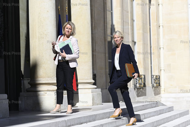 Caption : Conseil de défense écologique au palais de l'Elysée, à l'issue duquel les premières mesures issues de la Convention Citoyenne pour le Climat ont été annoncées (interdiction des terrasses chauffées, fin des chaudières au fioul,...). Barbara Pompili, ministre de la Transition écologique - Bérangère Abba, secrétaire d'Etat chargée de la biodiversité /// Ecological defense council at the Elysée Palace, at the end of which the first measures resulting from the Citizen's Convention for the Climate were announced (ban on heated terraces, end of oil-fired boilers,...). Barbara Pompili, Minister of Ecological Transition - Bérangère Abba, Junior Minister in charge of biodiversity - Paris - 27/07/2020 - Photo © Lionel Préau +33 (0)6 68 12 83 77