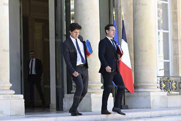 Légende : Conseil de défense écologique au palais de l'Elysée, à l'issue duquel les premières mesures issues de la Convention Citoyenne pour le Climat ont été annoncées (interdiction des terrasses chauffées, fin des chaudières au fioul,...). Julien Denormandie, ministre de l'Agriculture et de l'Alimentation - Jean-Baptiste Djebbari, ministre délégué chargé des Transports /// Ecological defense council at the Elysée Palace, at the end of which the first measures resulting from the Citizen's Convention for the Climate were announced (ban on heated terraces, end of oil-fired boilers,...). Julien Denormandie, Minister of Agriculture and Food - Jean-Baptiste Djebbari, Junior Minister responsible for Transport - Paris - 27/07/2020 - Photo © Lionel Préau +33 (0)6 68 12 83 77