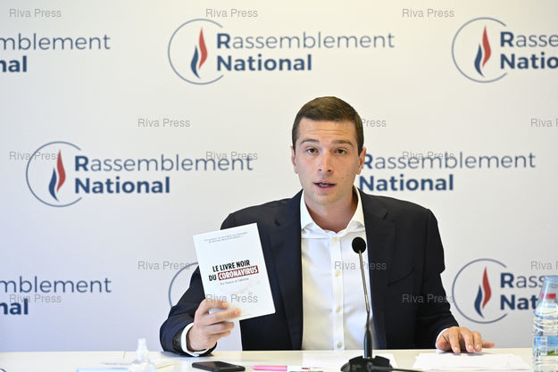 Légende : Jordan Bardella, vice-président du Rassemblement national, présente le "Livre noir du coronavirus" lors d'une conférence de presse, en présence de Marine Le Pen /// Jordan Bardella, vice-president of the Rassemblement national far-right Party, presents the "Black Book of the coronavirus" during a press conference, in the presence of Marine Le Pen - Nanterre - 28/07/2020 - Photo © Lionel Préau +33 (0)6 68 12 83 77