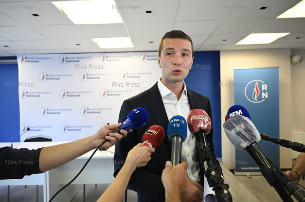 Légende : Jordan Bardella, vice-président du Rassemblement national, présente le "Livre noir du coronavirus" lors d'une conférence de presse, en présence de Marine Le Pen /// Jordan Bardella, vice-president of the Rassemblement national far-right Party, presents the "Black Book of the coronavirus" during a press conference, in the presence of Marine Le Pen - Nanterre - 28/07/2020 - Photo © Lionel Préau +33 (0)6 68 12 83 77
