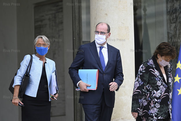Légende : Conseil des ministres au palais de l'Elysée. Elisabeth Borne, ministre du Travail, de l'Emploi et de l'Insertion - Jean Castex, premier ministre - Roselyne Bachelot, ministre de la Culture /// Cabinet meeting at the Elysee Palace. Elisabeth Borne, Minister of Labor, Employment and Integration - Jean Castex, Prime Minister - Roselyne Bachelot, Minister of Culture - Paris - 23/09/2020 - Photo © Lionel Préau +33 (0)6 68 12 83 77
