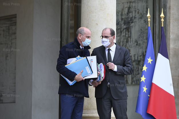 Légende : Conseil des ministres au palais de l'Elysée. Jean-Michel Blanquer, ministre de l'Éducation nationale, de la Jeunesse et des Sports - Jean Castex, premier ministre /// Cabinet meeting at the Elysee Palace. Jean-Michel Blanquer, Minister of National Education, Youth and Sports - Jean Castex, Prime Minister - Paris - 28/10/2020 - Photo © Lionel Préau +33 (0)6 68 12 83 77