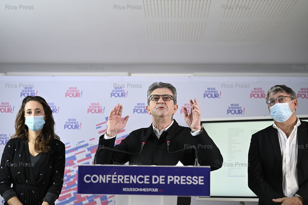 Légende : La France Insoumise lance un Comparateur de programmes pour l'élection présidentielle. En présence de Clémence Guetté, co-responsable du programme présidentiel, Jean-Luc Mélenchon, candidat à l'élection présidentielle 2022, Eric Coquerel, député de Seine-Saint-Denis /// La France Insoumise launches a program comparator for the presidential election. With Clémence Guetté, co-head of the presidential program, Jean-Luc Mélenchon, candidate for the 2022 presidential election, Eric Coquerel, MP of Seine-Saint-Denis - Paris - 17/02/2021 - Photo © Lionel Préau +33 (0)6 68 12 83 77