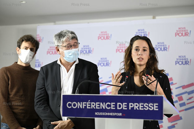 Légende : La France Insoumise lance un Comparateur de programmes pour l'élection présidentielle. En présence de Paul Vannier, assistant parlementaire de JL Mélenchon, Eric Coquerel, député de Seine-Saint-Denis, Clémence Guetté, co-responsable du programme présidentiel /// La France Insoumise launches a program comparator for the presidential election. With Paul Vannier, parliamentary assistant to JL Mélenchon, Eric Coquerel, MP of Seine-Saint-Denis, Clémence Guetté, co-head of the presidential program - Paris - 17/02/2021 - Photo © Lionel Préau +33 (0)6 68 12 83 77