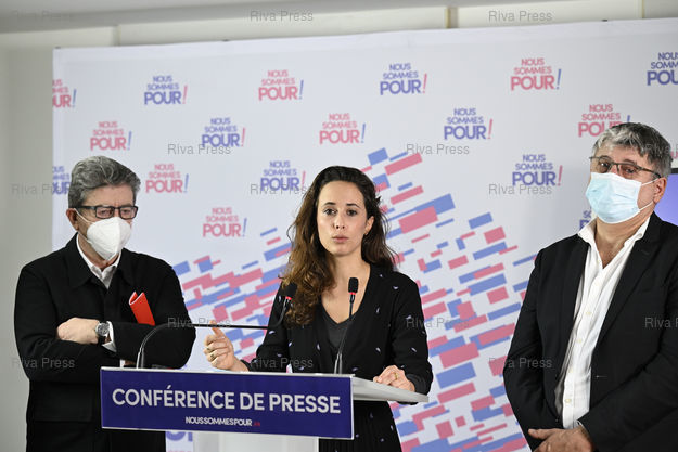 Légende : La France Insoumise lance un Comparateur de programmes pour l'élection présidentielle. En présence de Jean-Luc Mélenchon, candidat à l'élection présidentielle 2022, Clémence Guetté, co-responsable du programme présidentiel, Eric Coquerel, député de Seine-Saint-Denis /// La France Insoumise launches a program comparator for the presidential election. With Jean-Luc Mélenchon, candidate for the 2022 presidential election, Clémence Guetté, co-head of the presidential program, Eric Coquerel, MP of Seine-Saint-Denis - Paris - 17/02/2021 - Photo © Lionel Préau +33 (0)6 68 12 83 77