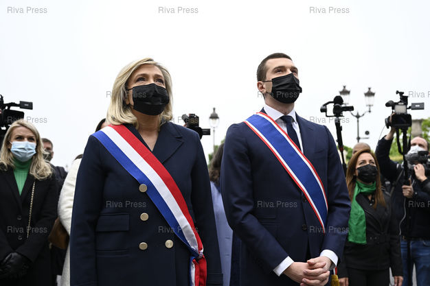 Légende : Marine Le Pen, présidente du Rassemblement National, et Jordan Bardella, vice-président du RN, député européen, au pied de la statue de Jeanne d'Arc pour y déposer une gerbe de fleurs /// Marine Le Pen, President of the far-right Rassemblement National Party, and Jordan Bardella, VP of the RN, MEP, at the foot of the statue of Joan of Arc to lay a wreath flowers - Paris - 01/05/2021 - Photo © Lionel Préau +33 (0)6 68 12 83 77